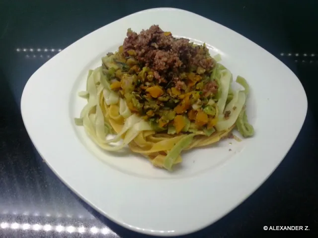 Bandnudeln mit Gemüse und Haschee